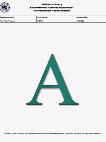 Our center has received an A rating by Maricopa County Environmental Services and we continue to ensure that our facility exceeds the health standards for food safety.