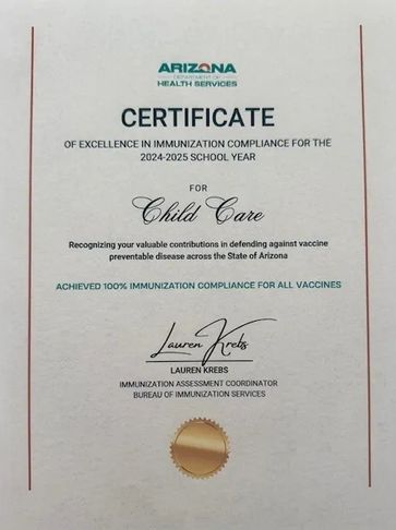 Our exceptional Director's earned a 100% compliance rating and continue to ensure that our center exceeds the guidelines established by the State of Arizona.